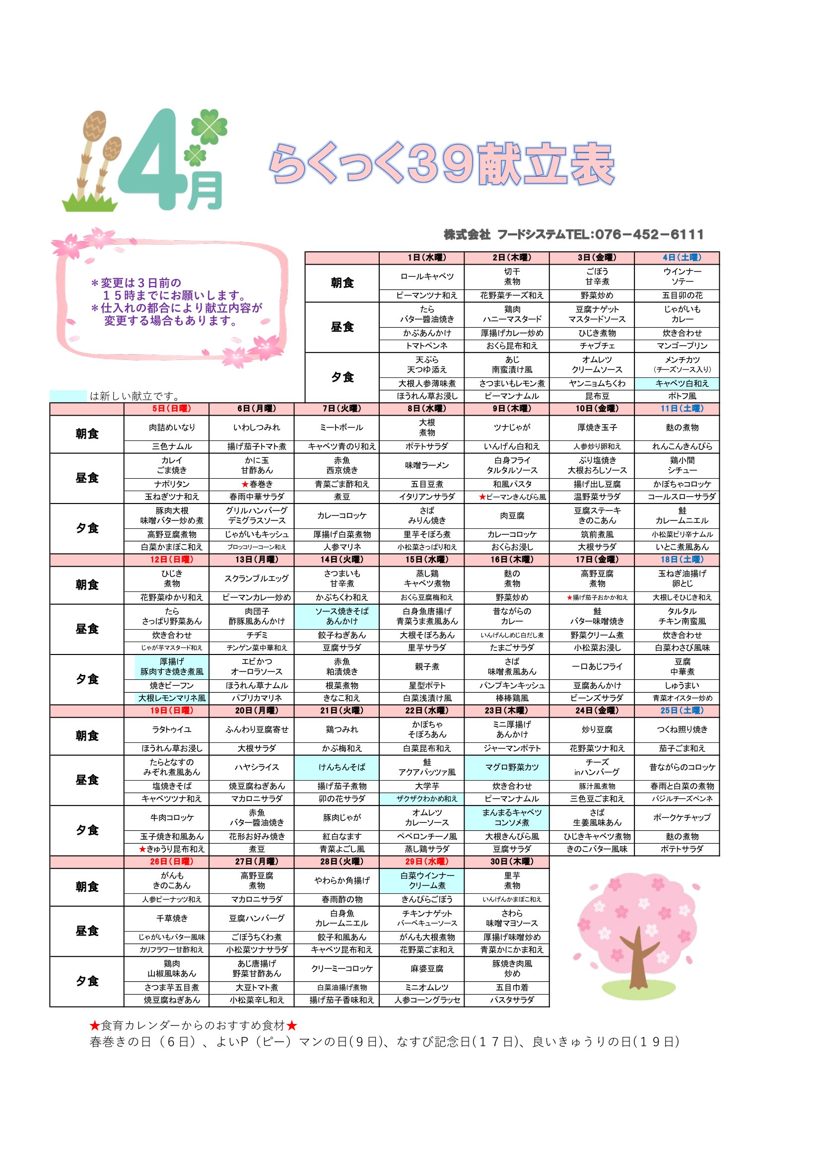 2026年4月の献立表~らくっく39~