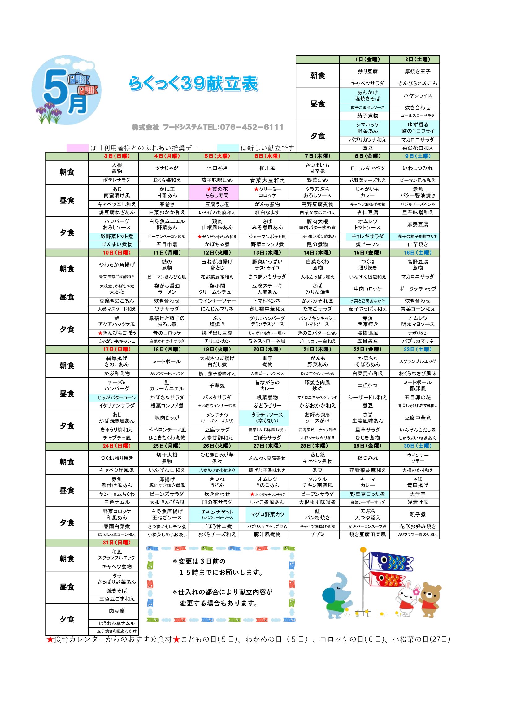 2026年5月の献立表~らくっく39~